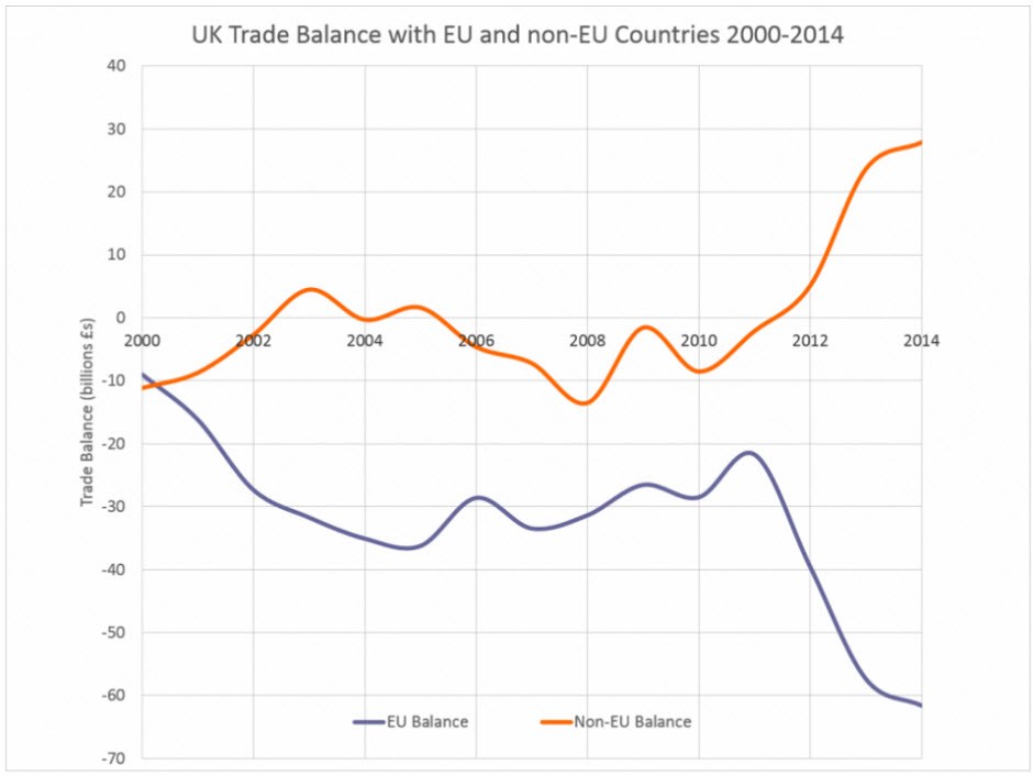 According to the chief executive of the “Vote Leave” campaign, Matthew Elliott, the drop in UK exports to Europe is linked to the poor economic conditions in the Eurozone, thus reducing demand from Europe, while demand from non-EU partners has grown. Therefore, a Brexit will allow British businesses to speak for themselves, as opposed to speaking as one of 28 countries. The chart below reflects the increase in trade balance of non-EU trade partners, compared to the EU, particularly since 2012.
