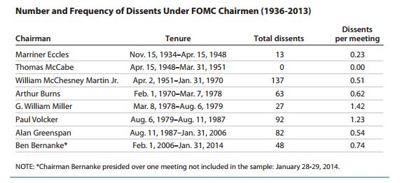 Yes, it’s true that three dissents at a single meeting is above the usual average. And, in many years over the past decade, there were fewer than five dissents for the entire year. But, the fact that 3 no votes out of ten can be seen as a sign of strife emanates from the fact that dissent of any kind on the FOMC has long been largely taboo.